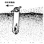 2. Work the tube in carefully with an up-and-down, rocking or twisting motion. Place finger or thumb over air vent, pull up. Remove the core of sand holding the clam. Do this in two or more stages if desired. DON’T HURRY!
