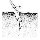 1. Insert shovel 3 to 6 inches from the "show." This distance depends upon the length of the blade and the amount of "hook" it has.